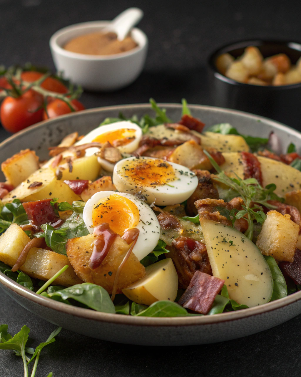 Conclusion : Avec ses textures riches et ses saveurs équilibrées, cette salade tiède de pommes de terre, lardons et œufs est un petit bonheur simple qui ne déçoit jamais. À vos fourneaux !